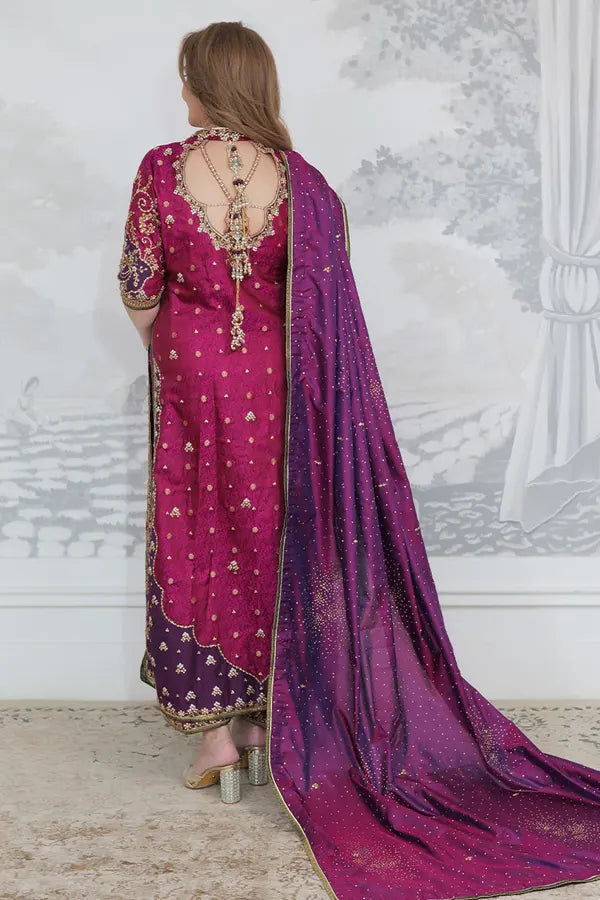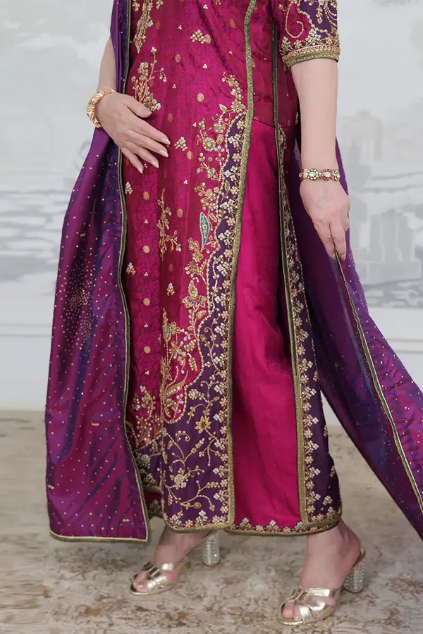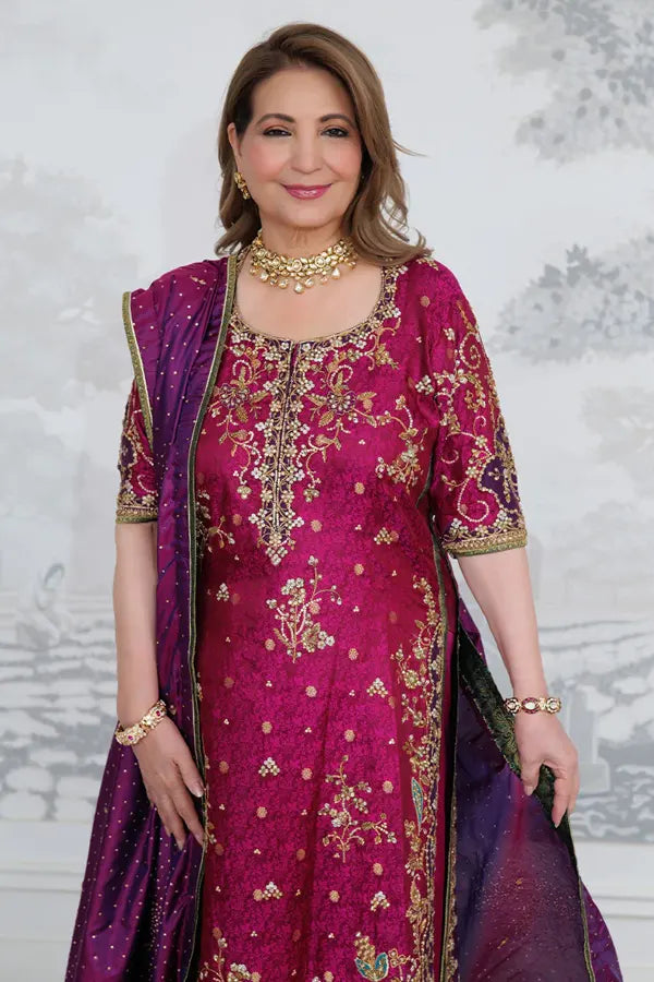 At Baroub, we introduce Bita Magenta Kurta – Farah Talib Aziz, a creation that radiates timeless charm through the art of color, craftsmanship, and composition. This ensemble is an ode to feminine grace—crafted with an intuitive balance between vibrance and restraint, classic artistry and modern ease.